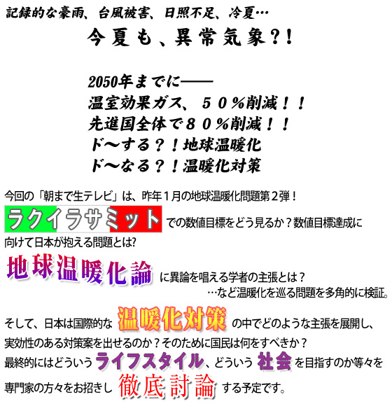 明日香 壽川(東北大学教授) 枝廣 淳子(環境ジャーナリスト) 江守 正多(国立環境研究所 温暖化リスク評価研究室長) 亀山 康子(国立環境研究所 温暖化対策評価研究室主任研究員) 澤 昭裕(21世紀政策研究所 研究主幹) 末吉 竹二郎(国連環境計画特別顧問) 武田 邦彦(中部大学総合工学研究所教授) 桝本 晃章(東京電力顧問) 丸山 茂徳(東京工業大学大学院教授) 吉崎 達彦(双日総研 主任エコノミスト)