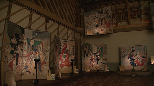 毎年7月、高知県香南市赤岡町では「絵金祭り」が開かれます。家々の軒下に飾られるのは、何枚もの芝居絵屏風。ロウソクの灯りに照らされた幻想的な絵が、訪れる人々を楽しませてくれます。