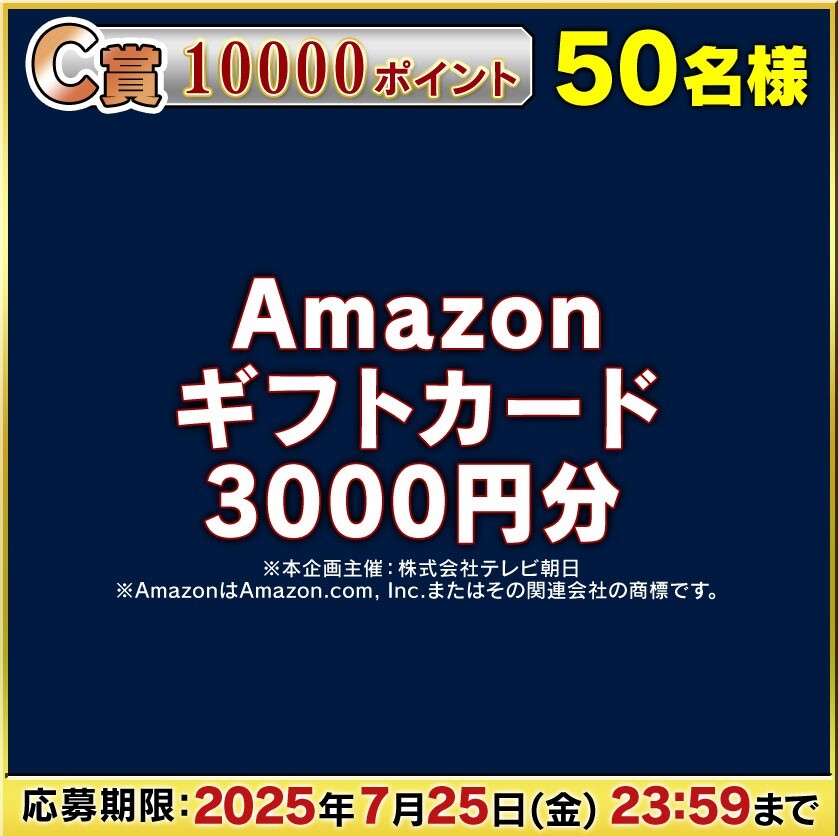 Amazonギフトカード3000円分 50名様 ※本企画はテレビ朝日が実施するものです。本企画についてのお問い合わせはAmazonではお受けしておりません。 ※AmazonはAmazon.com, Inc.又はその関連会社の商標です。