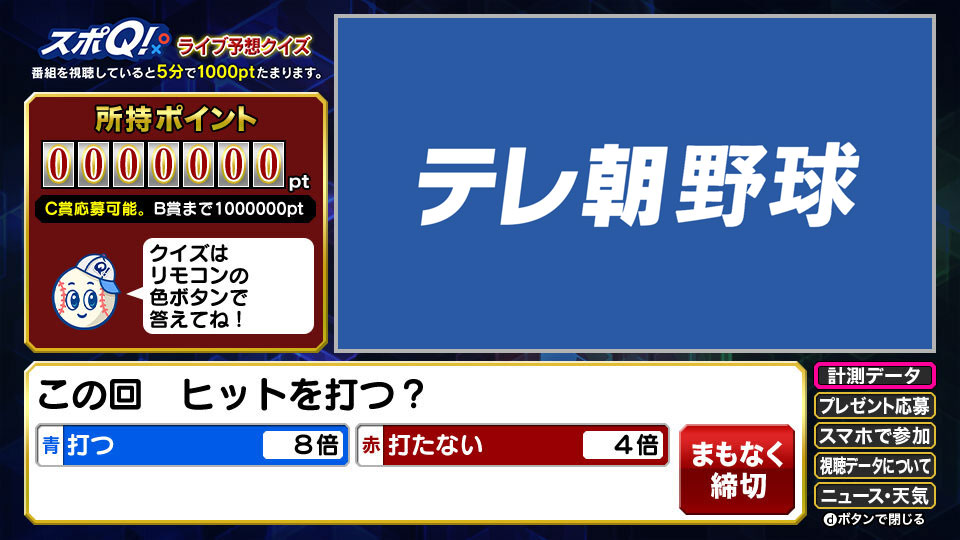 ・番組を視聴していると5分ごとに1000pt追加されます。 ・番組中に試合展開を予想するクイズが出題されますので、リモコンを使ってご参加ください。 ・クイズはリモコンの色ボタンを使っての操作となります。 ・回答を選択すると、使用するポイント数を選択する画面となります。使用するポイント数を色ボタンで選択してください。使用するポイント数を選択すると回答完了となります。 ・使用するポイント数の選択が完了しない状態で回答時間が締切となった場合、予想クイズは不参加となりますのでご注意ください。 ・正解の場合は、選択肢ごとに設定されている倍率と使用したポイント数が乗算され、所有ポイントに追加されます。 ・出題されるクイズ及びポイントの貯まり方は、本企画とWEB版とで異なる場合があります。