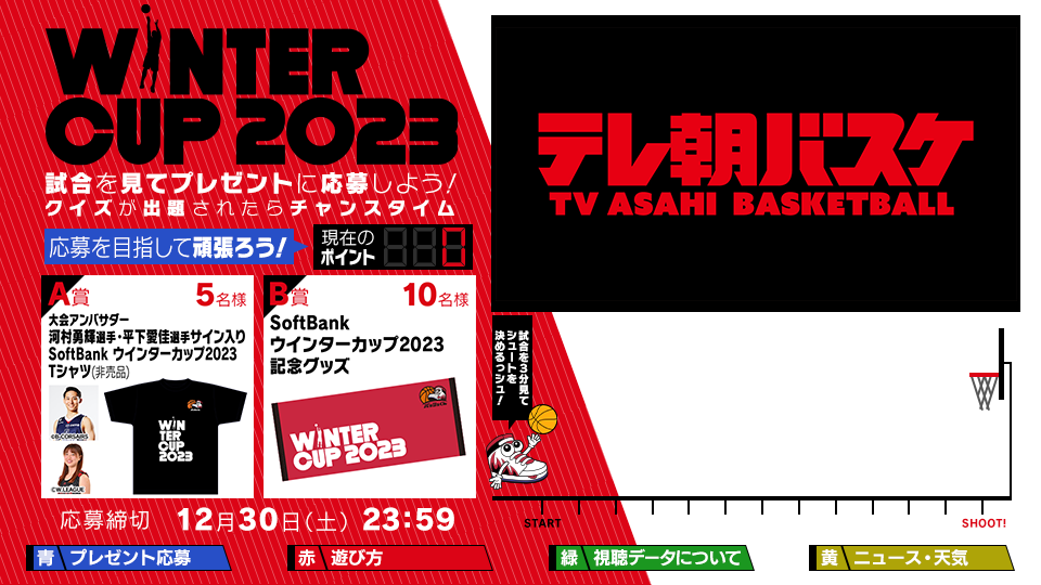 本規約は、株式会社テレビ朝日(以下「テレビ朝日」といいます。)が実施する、「SoftBank ウインターカップ2023 データ放送プレゼント」(以下「本企画」といいます。)でのプレゼント応募に関する事項を定めるものです。応募にあたっては、以下の内容をよくお読みいただき、同意のうえご応募ください。応募により本規約にご同意いただいたものとみなします。