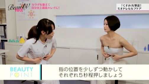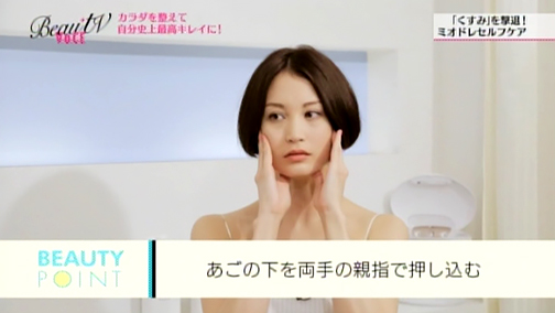 ここで、オンエアでもご紹介した「くすみ」に働きかけるミオドレのセルフケアをおさらいです! ミオドレは肌を温めて筋肉をゆるめてから行うと、より深くまで刺激を与えることができます。お風呂で温まってから行うのも良いですね。肌の滑りを良くするため、オイルや乳液などを使いましょう。