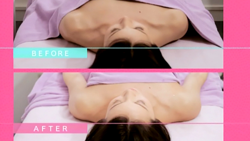 でも、終わってみるとこの通り! 施術前はベッドから浮いてしまっていた肩が、しっかり着いているのがわかります。「自分でも筋肉が緩んでいるのがわかります。胸が開いて息がしやすくなりました!」とエイミさん。