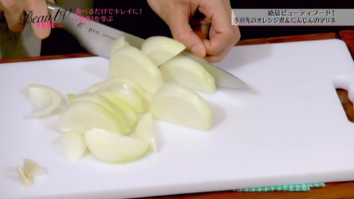 (2)タマネギを繊維にそって切る。