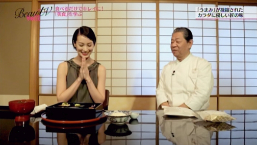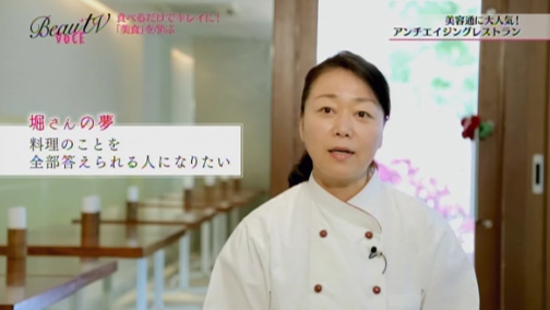 アンチエイジングレストランRire(リール)のオーナー兼シェフの堀知佐子さんのもとで、エイミが食べるだけでキレイになれるビューティフードに挑戦します。
