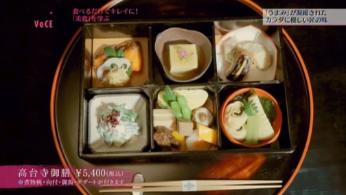 「きれいですね~!」と声を上げたエイミさんがいただいたのは、こちら。全国から集められた一級品の素材のみで作られた彩り豊かなお弁当です。バランスよく35品目ほど入って、たったの826キロカロリー。ダシの文化に裏打ちされたうまみが、なんともぜいたくな風味を醸し出しています。