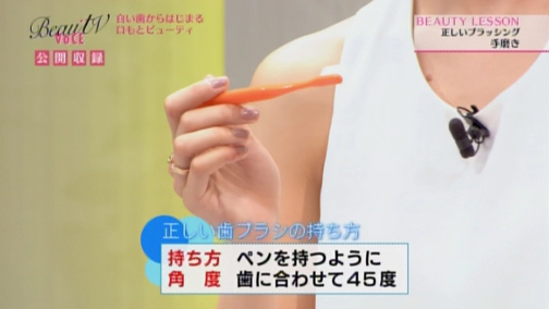 (1)ペンを持つように、親指、人挿し指、薬指でやさしくハブラシを持ってください。