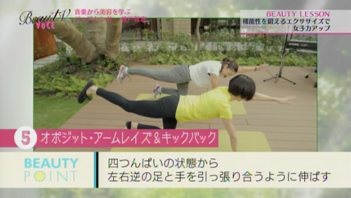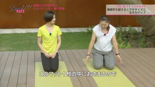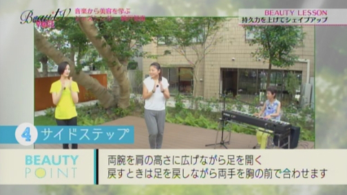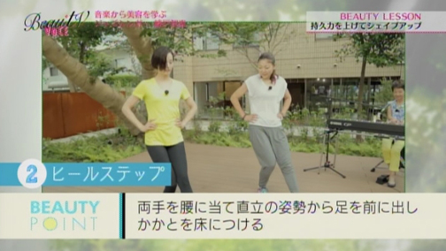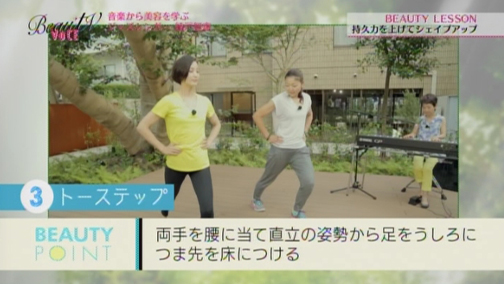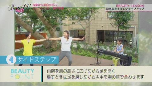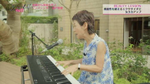 「確かに音楽を聴くと、その時どきで自分の気分が変わります」というエイミさんに、「そう。音楽はムードづくりに大きな仕事をしますよね。今日は音楽と一緒に踊るような感覚で体操してみて欲しいと思います」と綾戸さん。なんと今回は、ぜいたくにも綾戸さんの生演奏に合わせて、パーソナルトレーナー三浦香織さんによるビューティレッスンを行います!