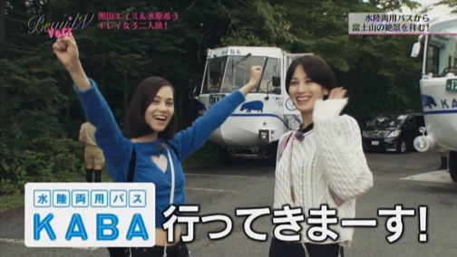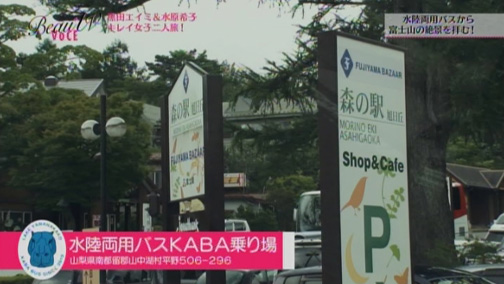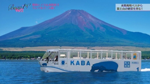 辿りついたのは山梨。世界遺産にも登録された富士山の周辺に、四季折々の美しい自然が広がっています。まずは山中湖へ。緑の中も、水上も楽しめる水陸両用バスは、女子旅におすすめのスポットです。