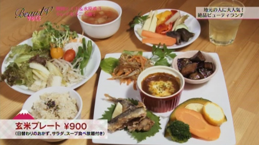 本日の日替わりランチは、こちらの玄米プレート。野菜のせいろ蒸しや小アジのそば粉揚げ、焼きチーズカレー、どれも絶品。体にやさしいビューティレシピなのがうれしいですね。「すごく野菜の味がしっかりしてる!」「おいしい!」と、2人も大満足の様子でした。