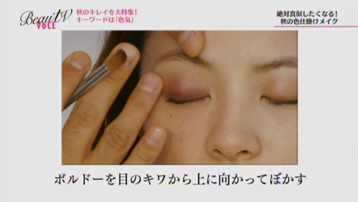 (6)ボルドーのアイシャドウを目のキワにのせ、上に向かってぼかします。