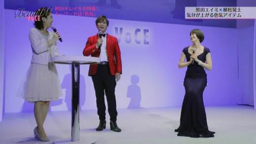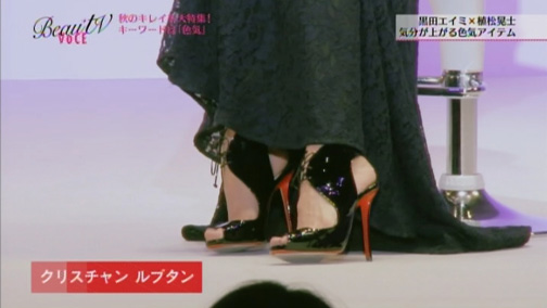 この日の黒田エイミさんは、黒のロングドレスで登場。モードなレースアップのヒールにレースのロングスカートを組み合わせた大人な雰囲気に、会場が湧きました。辛口ファッションチェックでお馴染みの植松晃士さんとのビューティートークでは、「眺めてるだけで気分が上がる!」と、靴好きを告白。