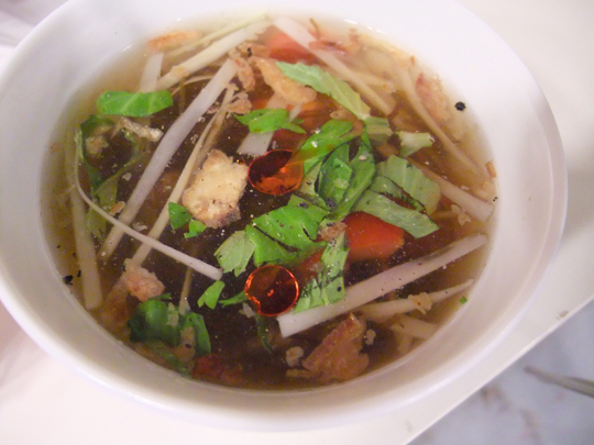 (2)お好みでセロリの葉、フライドオニオン、こしょう、ラー油をトッピングする。