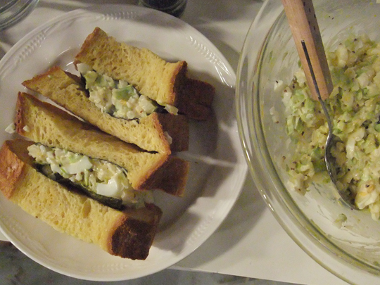 (3)(2)にゆで卵を入れ、フォークの背でつぶし、マヨネーズ、粒マスタード、塩、こしょうを加え、全体を混ぜる。