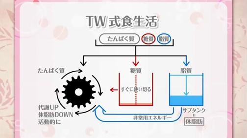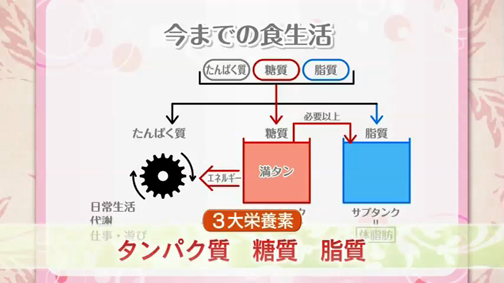 トータルワークアウト式食生活では、3大栄養素の「タンパク質」「糖質」「脂質」のうち、体の回復や補修に使われるタンパク質をできるだけ多くとるように心がけます。逆に、糖質のものは控えめに。体のエネルギーになるのは糖質と脂質ですが、メインで使われている糖質の量を減らすことで、サブのエネルギーとして貯蓄されがちな脂質が効果的に使われるそうです。