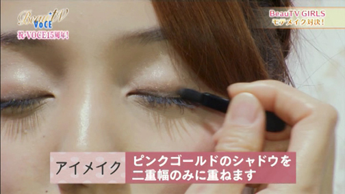 アイホールには指でハイライトカラーをのせます。次に、チップでピンクゴールドのシャドウを二重の幅の部分だけに重ねていきます。