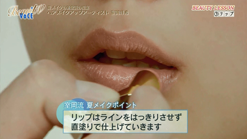 リップはイキイキとした明るい色を。直付けして、ラインをはっきりさせずにふわっと仕上げていきます。
