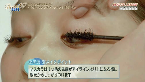マスカラは根元からしっかりつけます。目を開けた時にまつ毛の先端がアイラインの上にくるようにすると、目がイキイキしてきます。下まつ毛も自然に仕上げましょう。