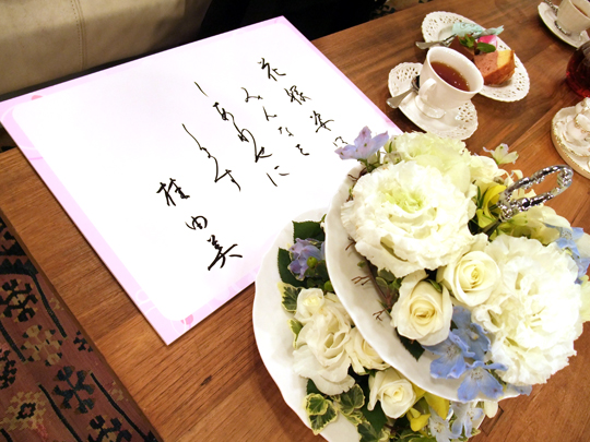ジェシカさんも驚いていましたが、本当に達筆ですね。実は、今日のスタジオで飾られていたお花には、桂由美さんの名前がついた真っ白なバラ「ローズユミ」も使われていたんですよ。最後に、桂由美さんの言葉と一緒にパチリ。BeauTV〜VOCE〜をご覧になった皆さんも、しあわせな気持ちになっていただけましたか?