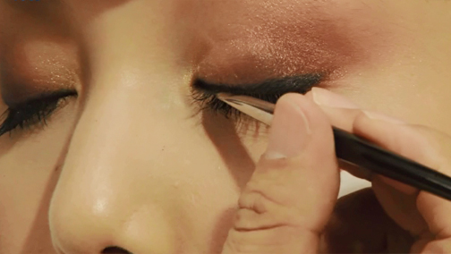 (10)最後にジェルタイプのアイライナーで仕上げていきます。グラデーションがつきにくいリキッドやジェルも、一度アイライナーを引いてからその内側に引くことで、自然なグラデーションができます。
