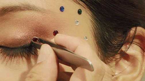 (11)今回はさらに華やかに、ラインストーンもプラス。右側をつけたら左側と、アシンメトリーにバランスを見ながら付けていきます。まぶたの上に付けてもおしゃれ!
