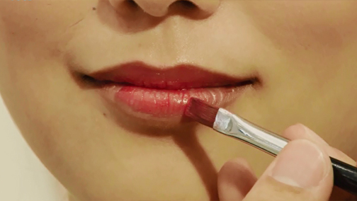 (12)アイシャドウに合わせて、リップも華やかな色味をチョイス。ティッシュで少し押さえてから、最後にリップクリームでツヤを出します。