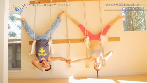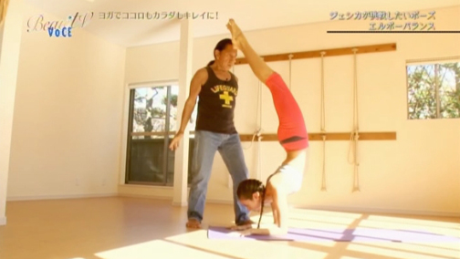 ジェシカさんが初めてケンさんと出会ったのは、ハワイで受けたヨガのレッスン。今回は荻窪にあるケンさんのスタジオへ伺い、ずっと挑戦したかったという憧れのポーズも教えてもらいました。「ケンさんに教えてもらうと、難しいポーズも簡単にできる!」というジェシカさん。ヘッドスタンドや壁にぶら下がるポーズもこの通りです!