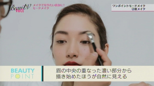 「眉の薄い人はどうすればいいですか?」というエイミさんの質問に、やはり「濃いところから広げていく」という基本が大事だと教えてくれたUDAさん。ガイドラインとして少し太めに理想的な眉毛を薄い色で作ってあげてから、本来あるべき濃いところからのせて、広げていくのが正解です。勇気を持ってぼさっとした眉にすることで、モードなメイクに!