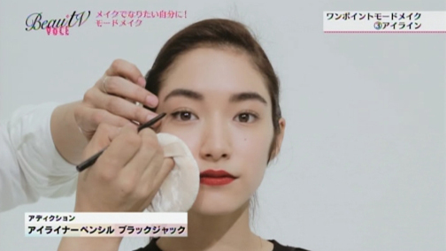 ここでUDAさんからアドバイス。「メイクをする時には、必ず鏡を正面で見ること」。ついついコンパクトの小さな鏡でささっとメイクをしがちですが、目が開いた時にどう見えるかの全体像をしっかり鏡に映すことで、はじめて全体のバランスがとれるのだそう。まずは鏡を正面で見たままのラインを引き、その後角度を変えて細かく仕上げていくのがメイク上手になるための秘訣です!