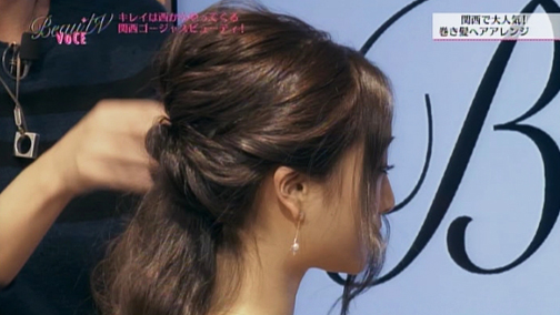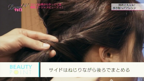 (2)前髪を残し、サイドの髪もねじりながら後ろにもっていき、まとめる。ここでも、髪を少し引き出してあげるのがポイント。