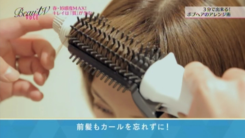 ブラシ感覚で、トップにボリューム、毛先をカール。