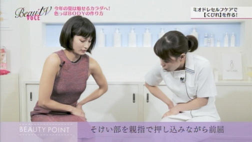 まずは女性らしい体の象徴、なめらかな曲線を描くくびれの作り方。「押す」ケアです。片手でも両手でもいいので、骨盤の少し上、足の付け根あたりのそけい部を親指でぐっと押し込むようにして、体を前へ倒します。イタ気持ちいい程度の強さで、左右10回ずつ行いましょう。
