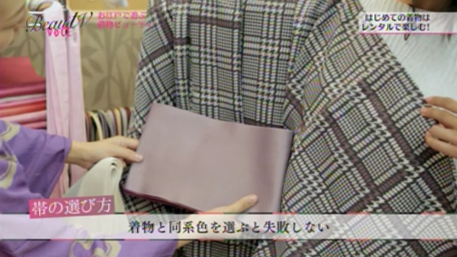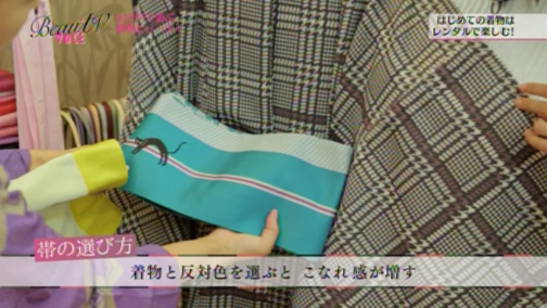 「エイミちゃんには、こんな寒色系の着物も似合いそうね」「好きな感じです!」と、お気に入りの一着が決定。帯は、着物と同系色を選ぶと初心者も失敗しないのでおすすめだそう。逆に着物と反対色を選んでも、こなれた感じに。