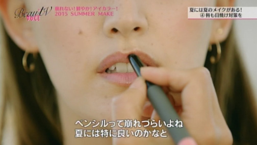 さらにリップ崩れを防ぐため、その上にピンクのリップペンシルを重ねます。