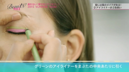 その上に引くのは、なんとグリーンのアイライナー。これぞYUKI流! 他には、ブルーとイエローの組み合わせなどもおすすめだとか。この夏、こんなアイライナーの2色使いに注目が集まりそうです!