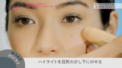 (6)ここで差を付けるプロの技! ハイライトを目尻の少し下にのせ、指でぼかします。
