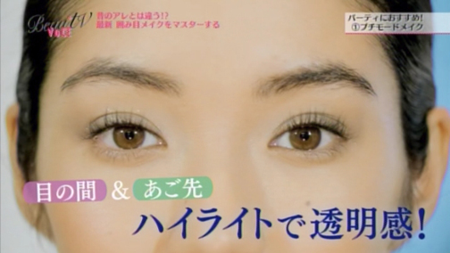 (7)さらに、目の間にもハイライトを。Tゾーンではなく、へこんでいる部分を光らせるのがポイントです。あご先にものせると、顔の中心にツヤがあることで透明感が出てきます。