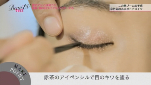 (4)赤茶のアイペンシルで目尻から目頭へ向けて目のキワを塗ります。黒ではなく、色みで深みを作るのがポイント。