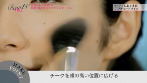 (8)チークを指でぼかし、ルースパウダーを上からまとわせます。血色感だけ残す仕上げに。