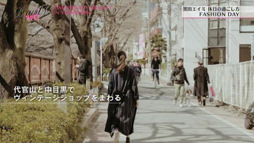 エイミさんの休日の過ごし方には、2つのパターンが。ひとつ目は、何も予定せずに家を出て、感性のおもむくまま歩く日。ひとまず表参道へ出てから、代官山、中目黒へ。気づくと4、5時間歩いていることもあるといいます。「途中でごはんを食べたり、セリーヌや、サンローランへ行ったり。代官山と中目黒に好きなビンテージショップが何軒かあるので、そこにも立ち寄ります。最後に足りないものを買いに、渋谷でAmerican ApparelやZARAへ」。