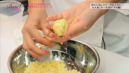 (2)直径3cm程度のボール状に形を整えます。すき間があると空気が入ってコーティングがきれいにできないので、出来るだけ表面をなめらかに成型します。形ができたら冷蔵庫で15分程度冷やし、生地を定着させましょう。