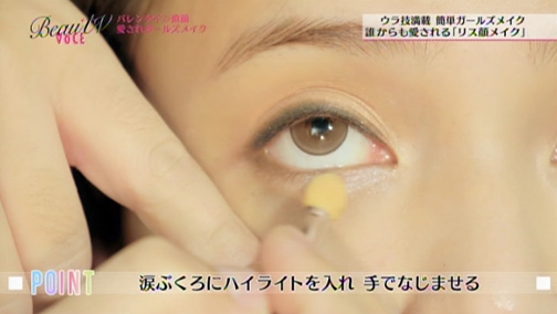 (5)涙袋にハイライトを入れ、手でなじませる。