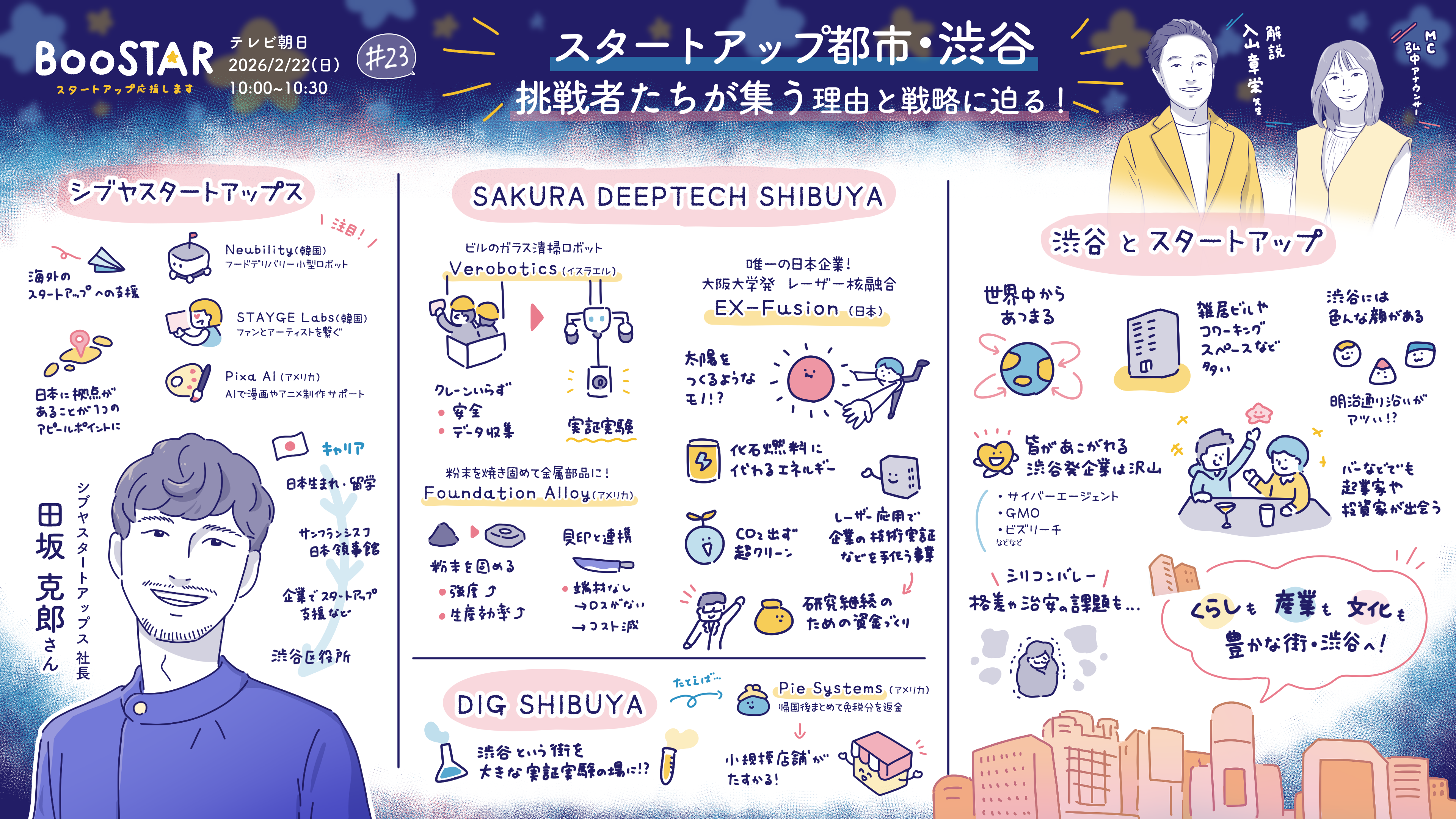 今回の番組では、渋谷に集まるスタートアップの中でも特に盛り上がりを見せているディープテック関連にフォーカス。渋谷サクラステージで行われているアクセラレータープログラムを取材すると、海外からは、ビルの外壁清掃ロボットを開発するスタートアップや、独自の製法で新しい金属を生み出すスタートアップ、日本からはレーザー核融合技術で次世代エネルギーを開発するスタートアップなど、様々な国から起業家たちが集まってきていた。なぜ渋谷なのか?その理由と戦略について聞いた。