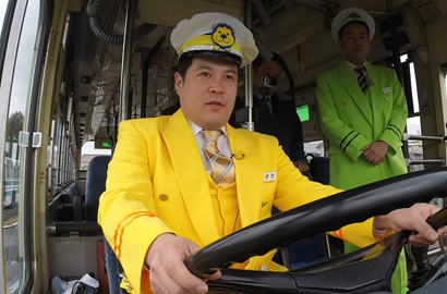 バス運転手見習いのタカトシは緑と黄色の、若葉マークをイメージした制服に身を包み、