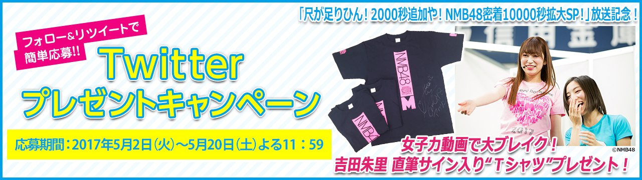 「尺が足りひん!2000秒追加や!NMB48密着10000秒拡大SP!」6月11日(日)午後4:00~の放送を記念して、女子力動画で大ブレイクした吉田朱里 直筆サイン入り“Tシャツ”を抽選で3名様にプレゼント!