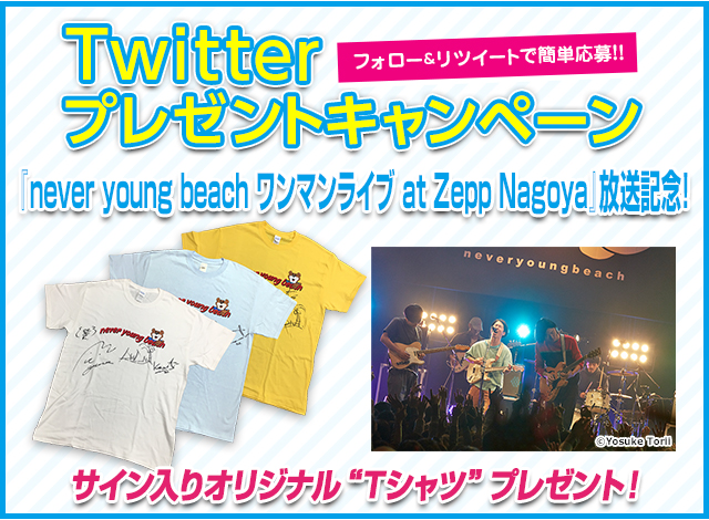 2月23日(土) よる9:00~『never young beach ワンマンライブ at Zepp Nagoya』の放送を記念して、サイン入りオリジナル “Tシャツ”を抽選で3名様にプレゼント!