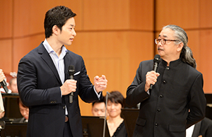 近年、伝説的なゲームの音楽を独立させたコンサートが世界的に流行っています。そのゲーム音楽の原点と言っても過言でない「スーパーマリオブラザーズ」が今年30周年を迎えるなど、ゲーム音楽はさらに盛り上がりをみせています。そこで本日の音楽会は「ファイナルファンタジー」シリーズの作曲者植松伸夫さんをお迎えし、ゲーム音楽の進化を紐解いていきました。