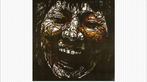 人物の顔の中に、特徴的な無数の黒い線が描かれた「切り絵作品」。