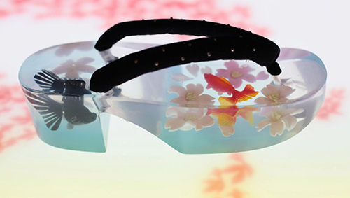 鳥の羽を素材として用いた下駄「鳳凰」や、つるし雛を直接取り付けた高下駄「ひなまつり」など斬新なデザインを生み出す、下駄アーティスト・鈴木千恵。
