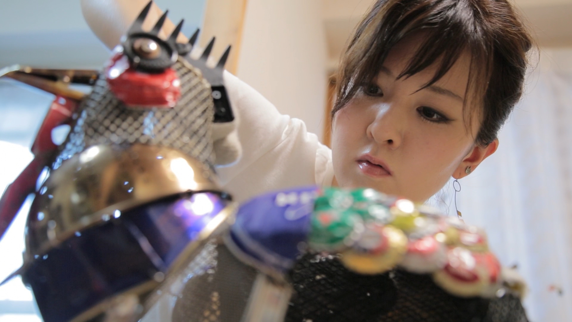 廃材をアートにリサイクルする富田。その作品に込められたデザイン・コードとは…